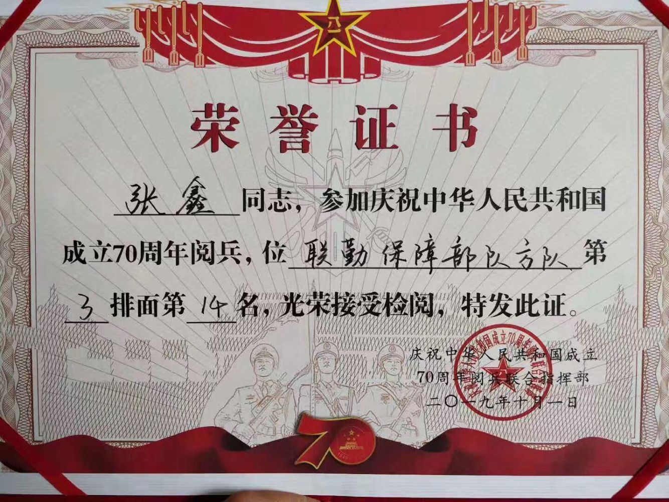 10月1日,举国欢腾,万世瞩目,中华人民共和国成立70周年庆祝活动在天安门广场隆重举行,气势磅礴、恢宏豪迈的大阅兵让全国人民热血沸腾。在这次阅兵队伍里我校2016届、2019届优秀毕业生卢长鑫和张鑫雄赳赳、气昂昂地走过主席台前接受检阅。