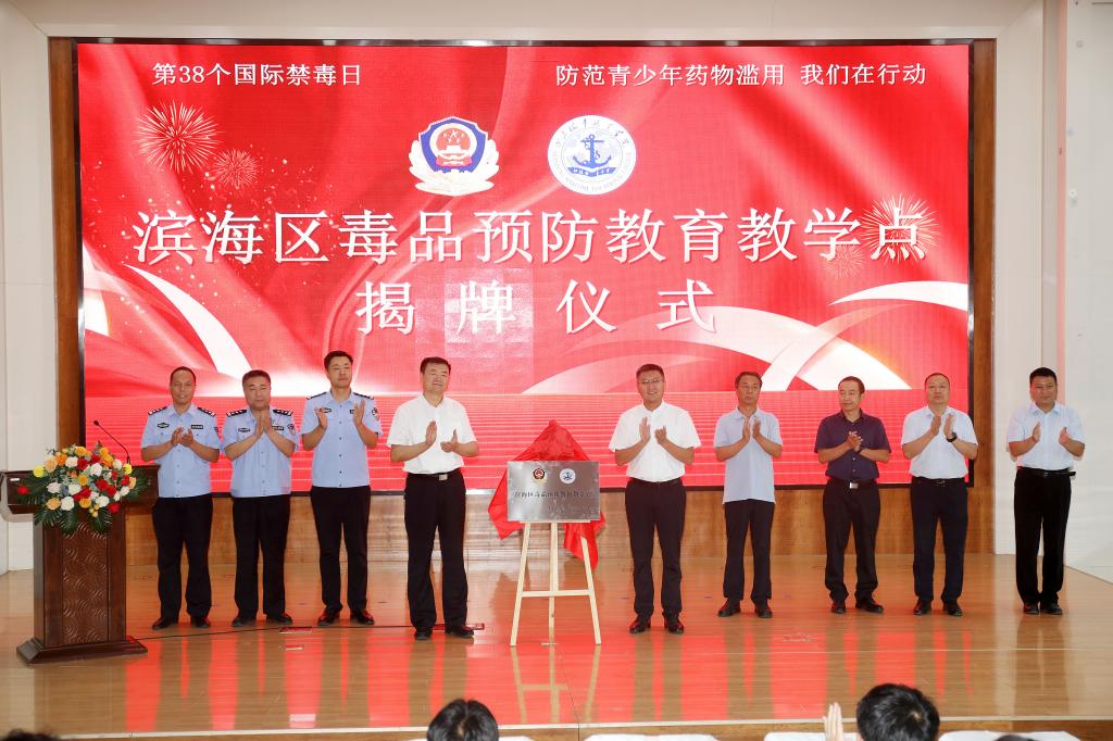 在第三十八个“国际禁毒日”来临之际,为深化青少年毒品预防教育体系建设,6月25日下午,滨海区毒品预防教育教学点授牌仪式在我校图书馆报告厅隆重举行。滨海区党工委委员、公安分局局长郭光才,我校党委副书记、校长徐立清共同为教学点揭牌,区公安分局、山东海洋科技大学园管理办公室及我校相关职能部门负责人、师生代表200余人参加活动。