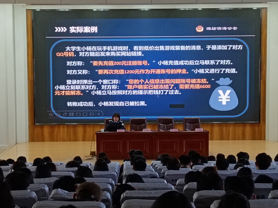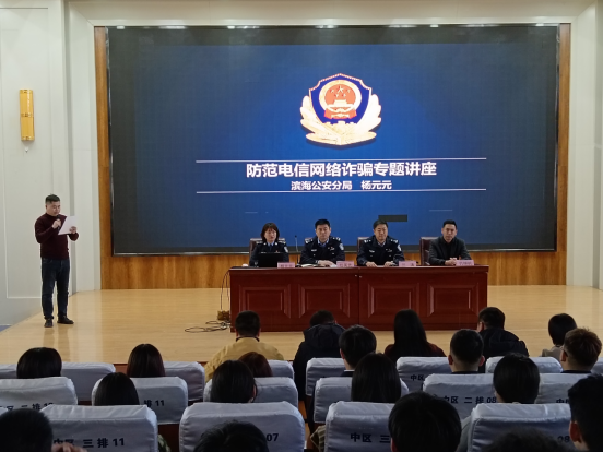 本次讲座由安全管理处主任助理郭海洋主持,滨海公安分局杨元元首先对电信诈骗惯用手段、典型案例通报讲解,提高了师生识诈、反诈自我防范能力,其次通过青少年犯罪案例的讲述,总结大学生犯罪的特点和核心提示,最后向所有同学提出了学法、懂法、守法、用法,远离犯罪、奋发进取的要求。