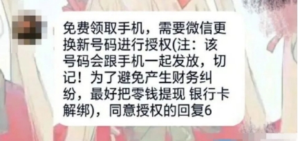 以免费领取手机为例,首先,骗子以“需要授权”为由,诱骗受害者更改微信绑定的手机号,将微信与骗子的手机号绑定。