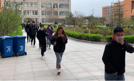 听到警报声,各位学生快速疏散,学生们弯着腰、猫着步,捂住口鼻,沿着学校指定楼梯口快速前进,有序撤离到学校的安全地带,随即各班班委清点人数。