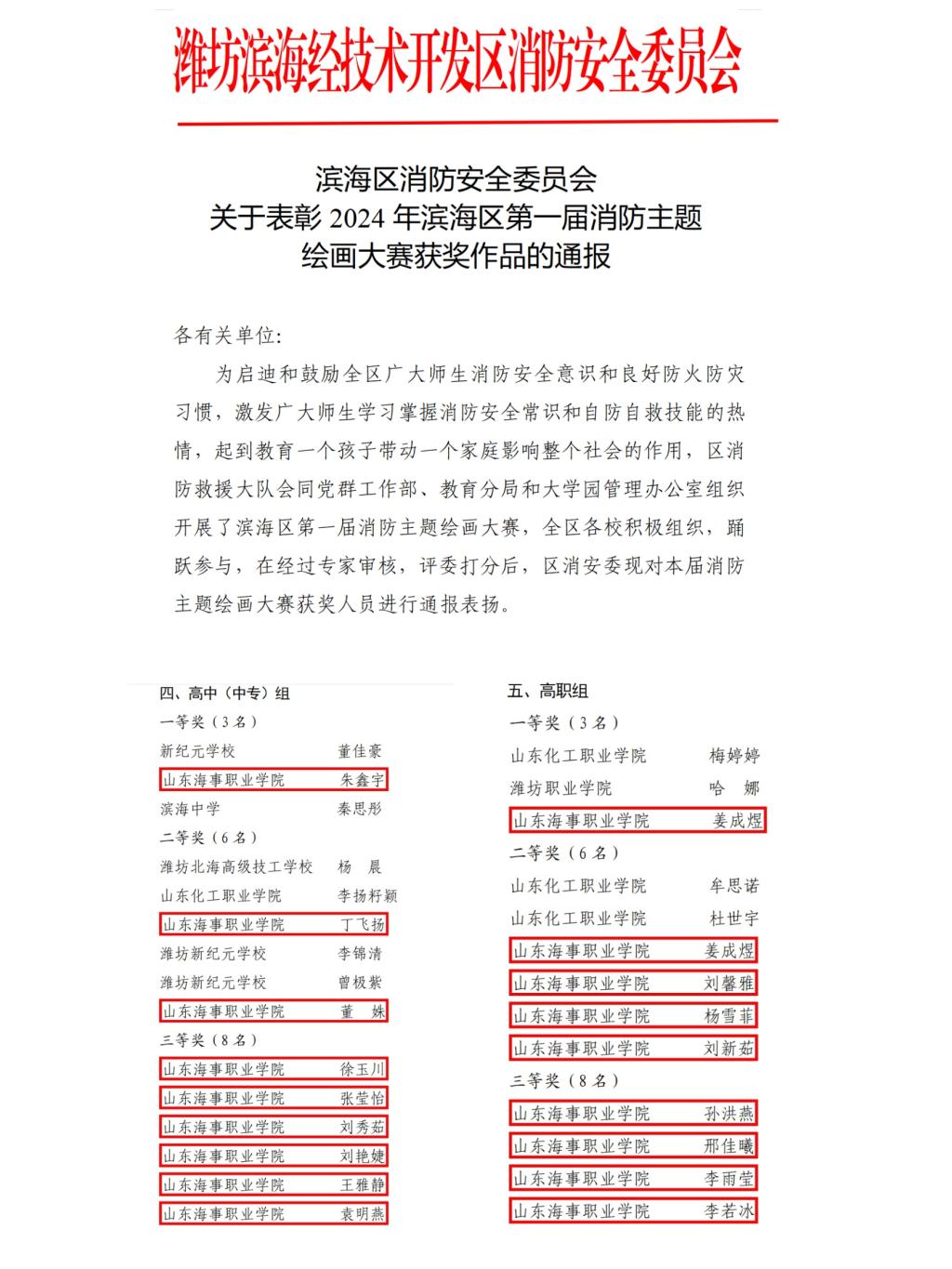 近日,由滨海区消防安全委员会、区党群工作部、区教育分局、山东(潍坊)海洋科技大学园管理办公室、区消防救援大队联合主办的第一届消防主题绘画大赛中,我校姜成煜同学荣获大赛高职组一等奖;姜成煜、刘馨雅、杨雪菲、刘秀茹同学荣获大赛高职组二等奖;孙洪燕、邢佳曦、李雨莹、李若冰同学荣获大赛高职组三等奖;朱鑫宇同学荣获大赛高中(中职)组一等奖;丁飞扬、董姝同学荣获大赛高中(中职)组二等奖;徐玉川、张莹怡、刘秀茹、刘艳婕、王雅静、袁明燕同学荣获大赛高中(中职)组三等奖。