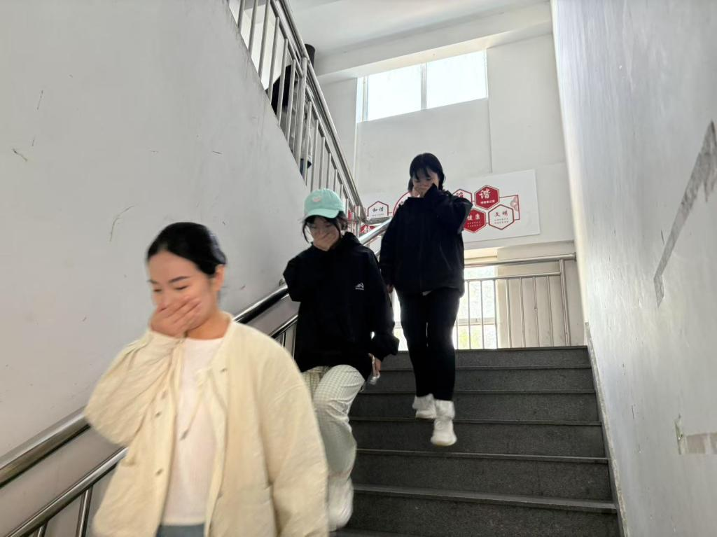 随着警报声响起,应急疏散演练正式开始。各小组工作人员迅速到达指定岗位,引导学生快速、有序地按照预定的疏散路线撤离宿舍。学生们弯腰低姿,用湿毛巾捂住口鼻,紧张而不慌乱地从宿舍撤离,有序向公寓前广场等安全区域疏散。整个疏散过程迅速、有序,达到了预期效果。