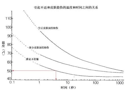 看看下面这张图,50℃的温度持续接触5秒人就会感受到不舒服,随着时间延长,对皮肤的伤害程度加大。