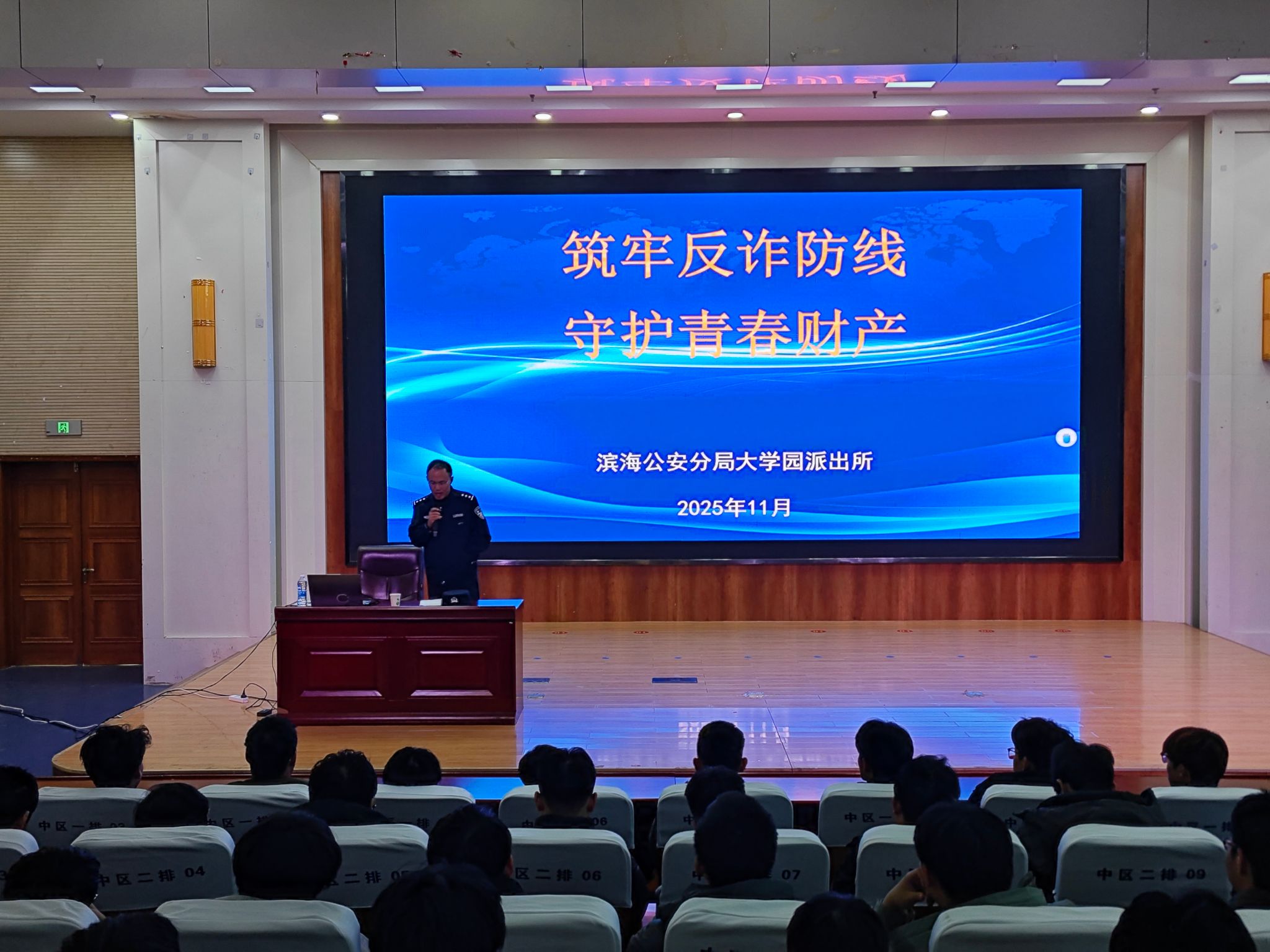 2025年11月19日,我校特邀滨海公安分局大学园派出所公安警官入校,举办“筑牢反诈防线,守护青春财产”防范电信诈骗主题讲座。
